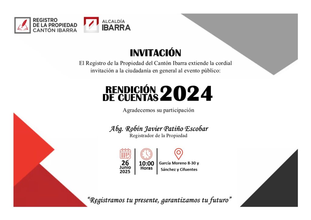 De conformidad con la normativa vigente, el registro de la Propiedad del Cantón Ibarra presenta su rendición de cuentas bajo un mecanismo participativo para informar a la ciudadanía de las acciones en el ejercicio de nuestra gestión y en la administración de los recursos públicos.